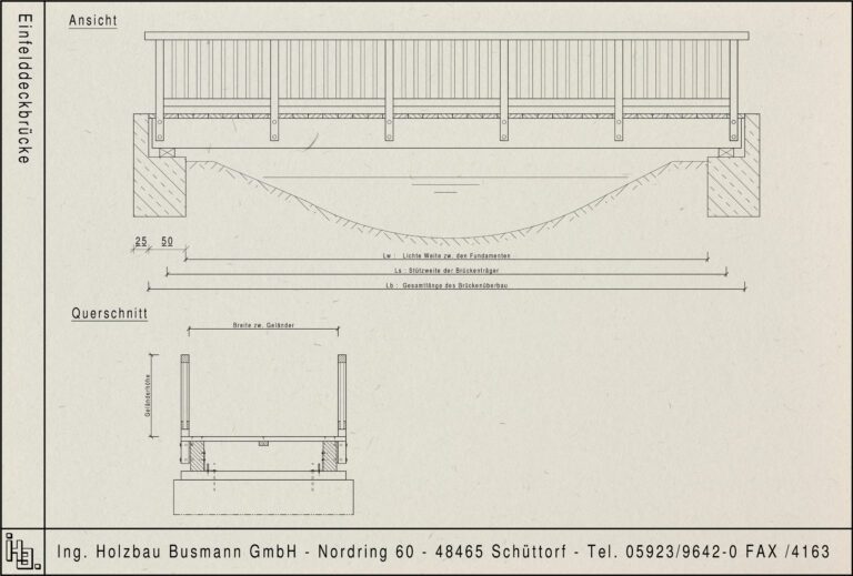Unsere Firma blickt auf siebzig Jahre Erfahrung im Brückenbau zurück. In den Anfängen schloss sich einer der Tischlerbrüder Busmann den Pionieren an, wobei er seine Leidenschaft für die Kunst des Brückenbaus entdeckte. Sein erstes Werk war eine eindrucksvolle Holzkonstruktion über den malerischen Fluss “Vechte” in seinem Heimatort Schüttorf. Heutzutage sind wir bundesweit im Brückenbau tätig, wo wir mit Hingabe und Fachkenntnissen Brücken jeglicher Art konzipieren, errichten und instand setzen.